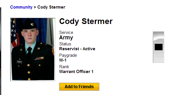 Scotty’s FOIA Machine strikes again, this time with Cody Stermer, seen in his authorized uniform above. Cody claims to be a Warrant Officer in the Army, and he’s a helicopter pilot, in his mind.
